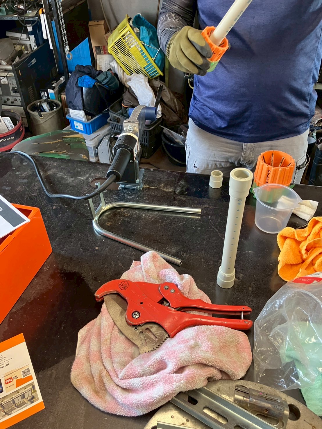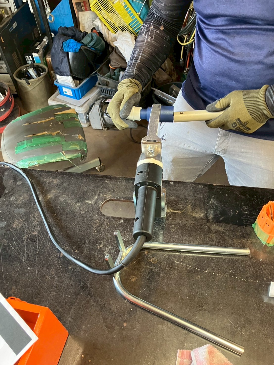 加熱後に継ぎ手とパイプを差し込み、冷めると製品が完成となります。