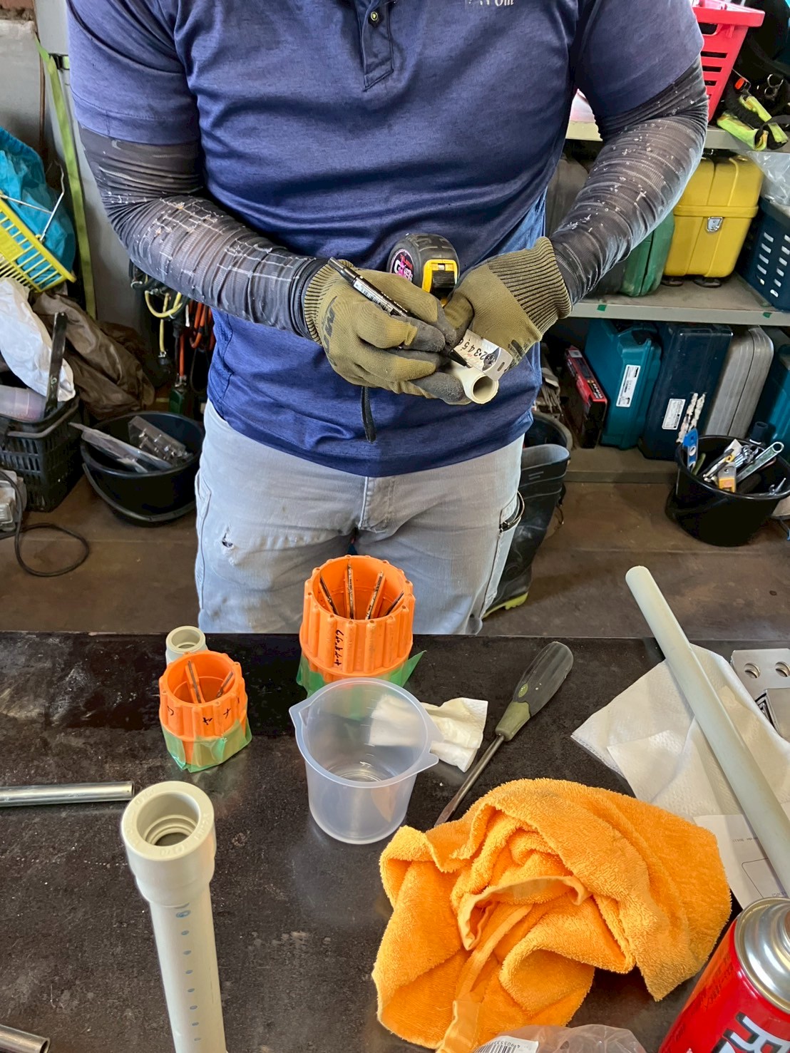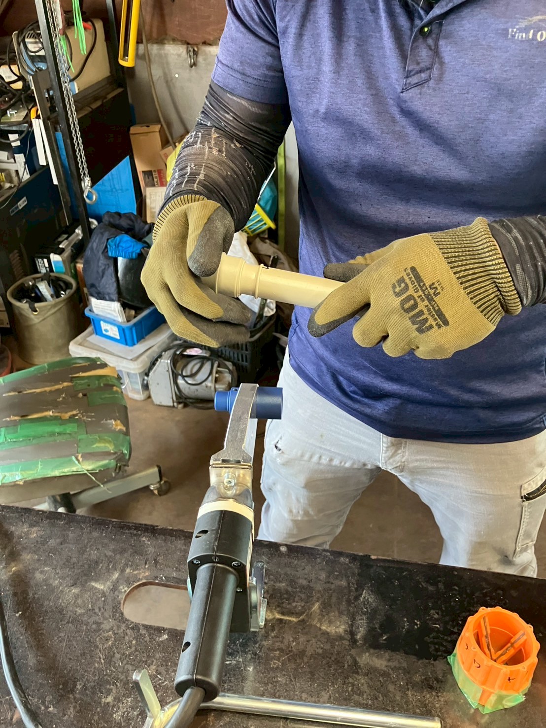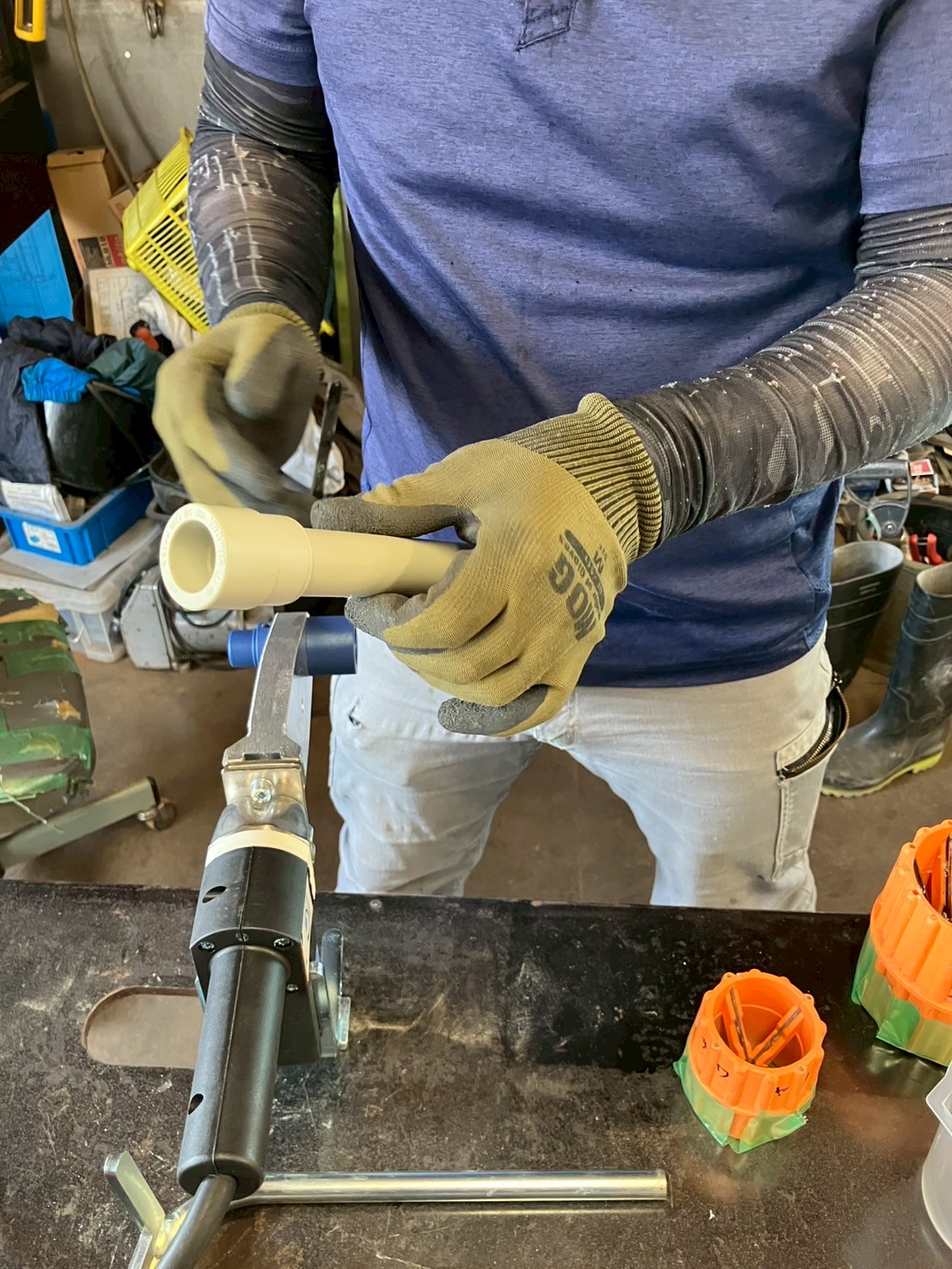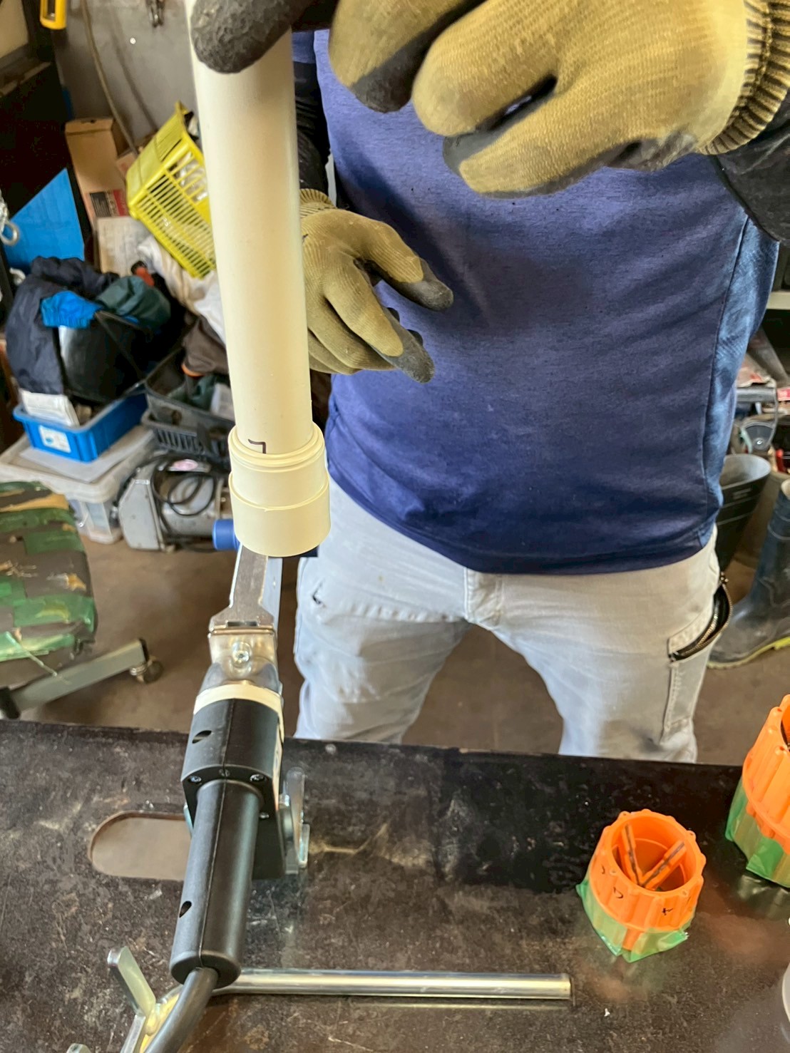 パイプと継ぎ手の接合部を洗浄後、溶着機にパイプと継ぎ手部をはめ込み、加熱します。
